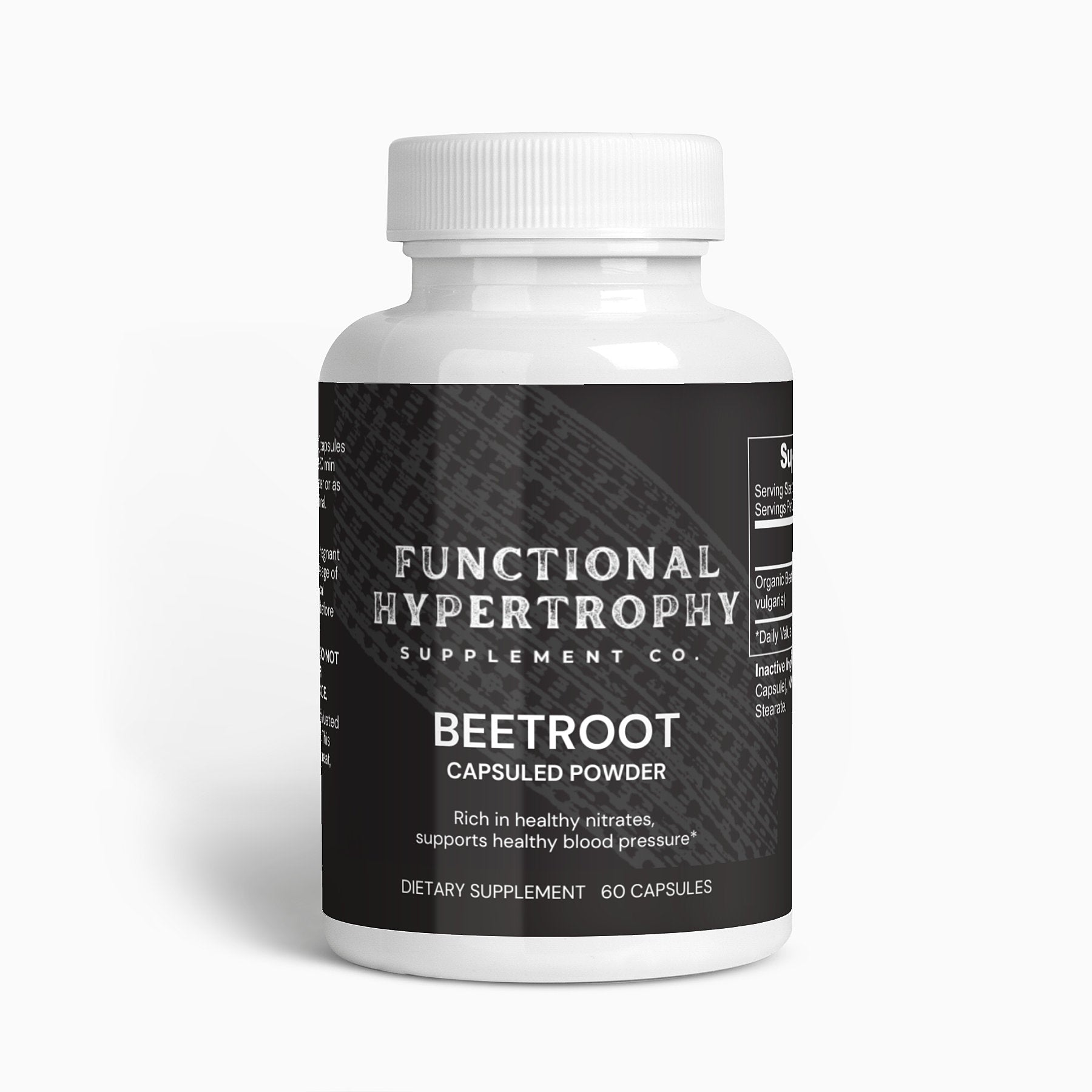 Ingredients: Organic Beetroot Powder (beta vulgaris), Cellulose (Vegetable Capsule), Microcrystalline Cellulose, Magnesium Stearate.